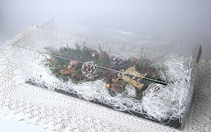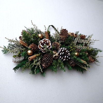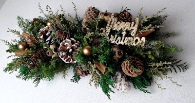 ☆サイズ:横 37p、縦 14p ☆使用花材 ・プリザーブドフラワー::ヒムロスギ、コヒバ、ラヌギノーサ、ストーベ ・ドライ花材:松かさ、トウヒ、エゾマツ、カラマツ、シナモン、アンバーナッツ ・アートフラワー:無し ・資材:リボン、クリスマスバー、金ボール |
