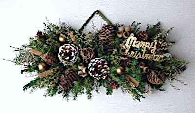 赤・ワイン色のバラとマツカサ・ヒイラギ・リンゴなどを飾ったスワッグを幅広の金色のリボンで囲みました。 やや青みがかったブルーアイスの葉と長い白樺の小枝が大人っぽく存在感のあるスワッグです。 |