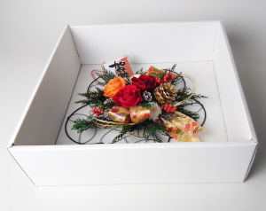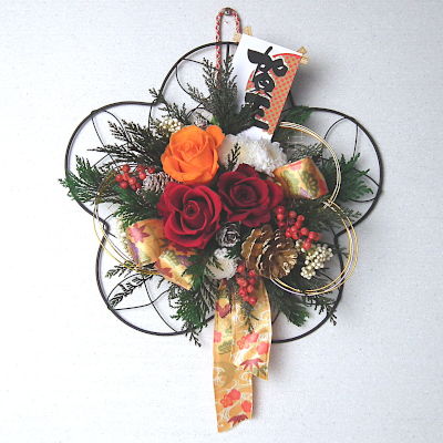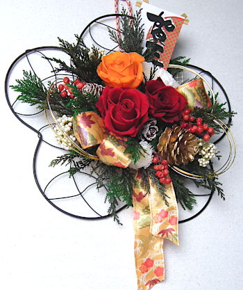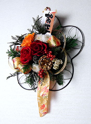 | 黒い梅型ベースに鮮やかな色合いのバラを飾りました。 派手になりがちな赤とオレンジですが、白い小菊・濃い緑のヒバの葉などを合わせて、お正月らしい明るい壁掛けとなっております。 |
