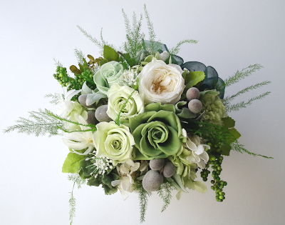 白い竹かごにグリーン・ホワイトのバラとグレーのオリーブの実を挿し、繊細なアスパラガスの葉を全体に広げました。 色味を抑えたアレンジはナチュラルで落ち着いた雰囲気です。 ありがとうございました。販売終了致します。 |